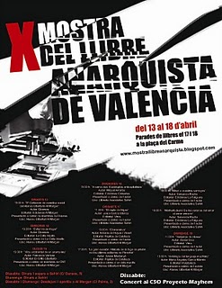 Os informamos de que la Mostra Del Llibre Anarquista se celebrará en Valencia del 12 al 18 de Abril,los días 17 y 18 estarán montados los puestos en la plaza del Carmen con las distintas editoriales participantes en la Mostra.
