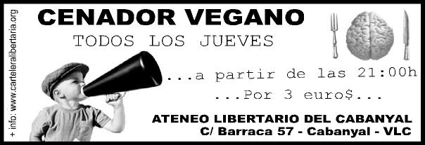 Una Temporada mas..y ya van 4, vuelven los Cenadores Veganos al Ateneo Libertario del Cabanyal, TODOS LOS JUEVES a partir de las 21:00h. la Cenita estará preparada..si quieres pasarte antes, el Ateneo está abierto desde las 20h..y siempre se puede echar una mano a cocinar, tomarse algo o echar un ojo a la las Distribuidoras Anticomerciales, SOROLL (http://distrisoroll.blogspot.com/) y TUmbando Gigantes..con las ultimas novedades en libros, cds, vinilos kamis etc..