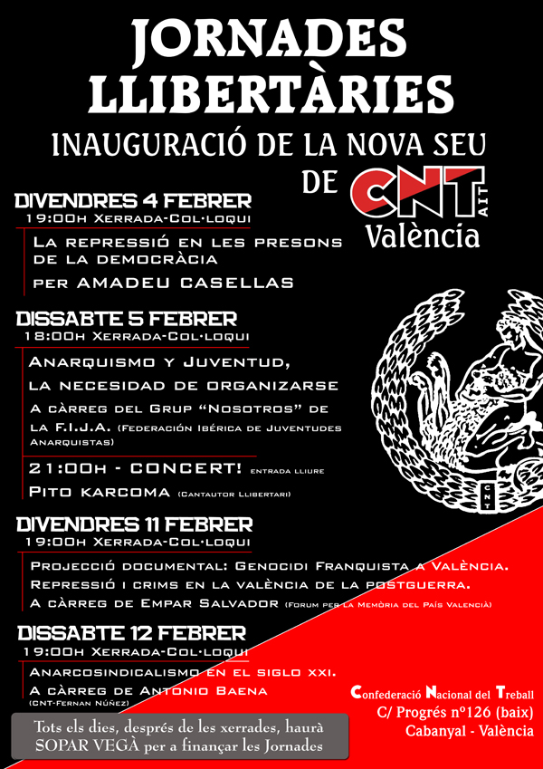 Estais invitad@s para acudir y participar en las Jornadas Libertarias que ha preparado elSindicato de Oficios Varios de CNT en Valencia para la inauguración de su nueva sede en la ciudad
