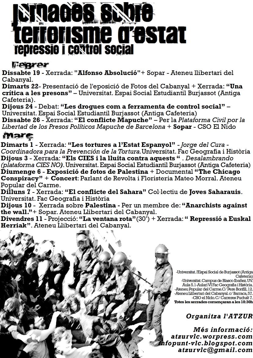 Terrorisme d’estat, repressió i control social. Ningú no vol sentir parlar d’aquestes paraules, i si algú en fa ús d’elles serà per referir-se a estats “en vies de desenvolupament” o dictadures. Però sembla que ací, a l’estat espanyol, aquestes coses no passen i si passen estem disposats a tancar els ulls.