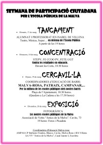 La Coordinadora de Educación Malva-rosa en lucha por las anteriores reivindicaciones y continuando las movilizaciones de todo el curso convoca una “Semana Ciudadana reivindicativa por la escuela pública en la Malva-rosa” con el siguiente calendario: