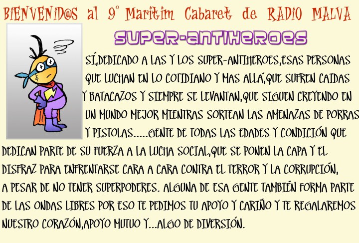 En las calles compartimos la primavera # valenciana NO A LOS RECORTES DE DERECHOS y ahora nos llego el turno de compartir con todos y todas Ustedes , el motivo por el cual nos hace libres como MEDIO DE COMUNICACIÓN INDEPENDIENTE : el 9 Cabaret , que nos permite AUTOGESTIONAR nuestros recursos y seguir gestionando una comunicación democrática , ciudadana y sobre todas las cosas participativa e inclusiva . Por tal motivo los invitamos una vez mas a vivir una noche de magia , de sueños y aventuras solidarizándose con los medios de comunicación alternativos , sociales y comunitarios , donde tod@s somos antenas /Muchas gracias