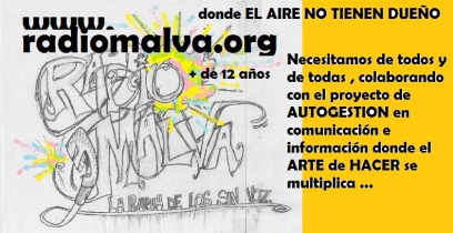 Radio Malva , hace mas de 12 años que construye comunicación libre , pluralista e inclusiva es una buena oportunidad para dar las gracias (grandes , muy grandes ) a todos y todas los que directa o indirectamente colaboraron en el poseso dinamizador y sistemático de participación en la comunicacional alternativa desde el barrio para el mundo .