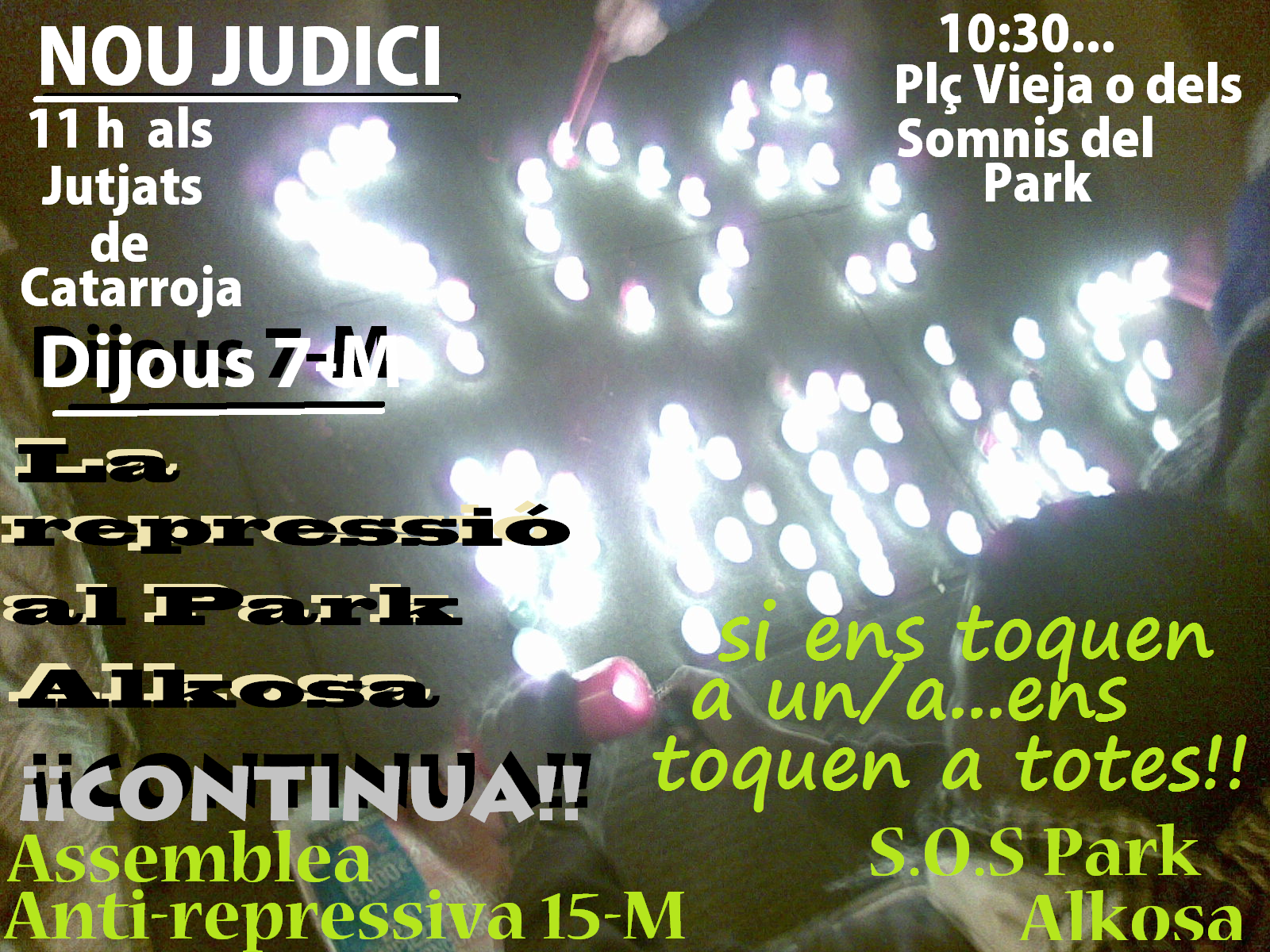 Cualquier acto que es convocado desde la Koordinadora de Kolectivos del Parke ya sea infantil, lúdico cultural, informativo es denegado con fundamentos insostenibles por el Ayuntamiento, aunque esos mismos actos hayan sido realizados en los mismos espacios por el propio ayuntamiento. Quizá lo ilegal y que debe ser prohibido es el hecho de que los habitantes del Parke cada vez se encuentran más, se reconocen, se juntan, hablan, se ríen y hasta bailan buscando entre todos salidas dignas al escenario de hambre, exclusión, paro, … en el que les han colocado estos señores de la represión, de los gobiernos, de la corrupción, de los mercados…. La última. Nuestro compañero Ariel. Estaba invitando a sus vecinos del Parke con un megáfono a bajar a la plaza y juntarse y charlar un rato, cuando las fuerzas del orden le exigieron un permiso del Ministerio de Industria: DESACATO A LA AUTORIDAD Y JUICIO RÁPIDO. Ariel solo tenía el permiso de sus padres. El próximo jueves nuestro compañero Ariel será juzgado por desacato a la autoridad a las 11,00 h en los juzgados de Catarroja