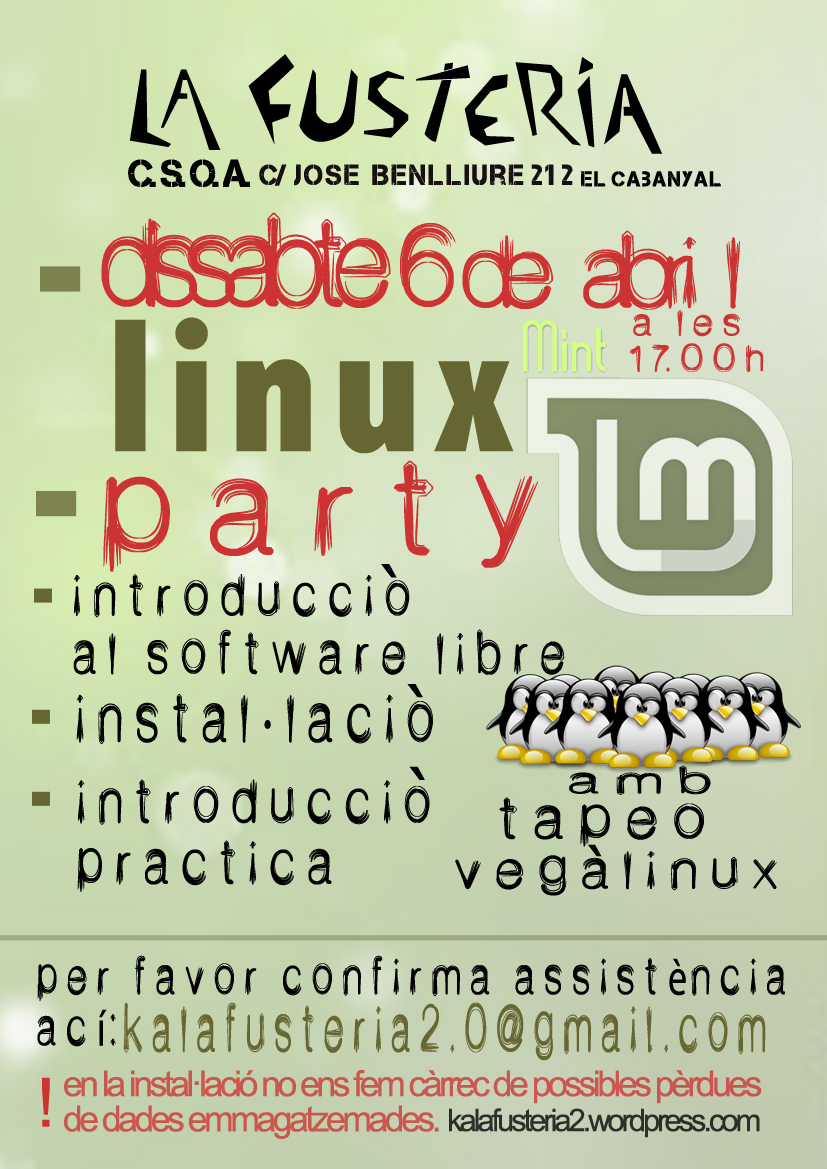 El dissabte 6 d’abril a partir de les 17h farem unes jornades dedicades a linux, el programari lliure per excel·lència. A aquestes jornades volem aprofundir una mica en el que suposa un programari lliure i en facilitar la seua utilització i difusió.