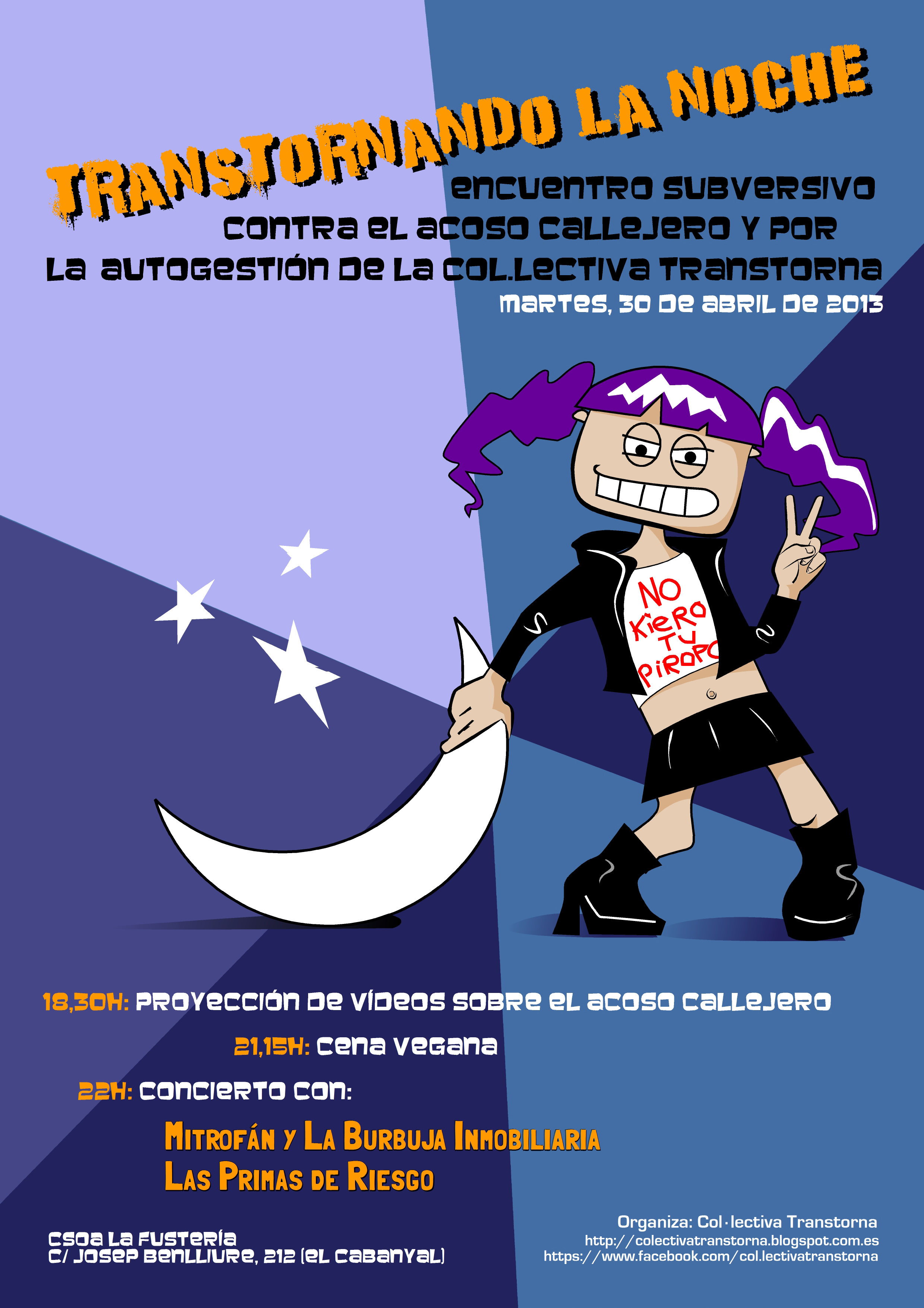 Este próximo martes, 30 de abril, a las 18h30, en el CSOA La Fustería (C/ Josep Benlliure, 212), la Col.lectiva Transtorna os invita a todxs a pasar una tarde/noche de reflexión y depuración acerca del acoso sexual en las calles.