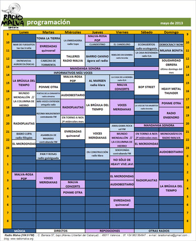 Con el mes de mayo (2013) llega calentita a tu antena o a tu reproductor la nueva programación de Radio Malva, con nuevos programas propios, una selección de podcasts de los mejores programas de otras radios libres hermanas, y una continuidad de música copyleft por géneros pensada para cada momento del día.