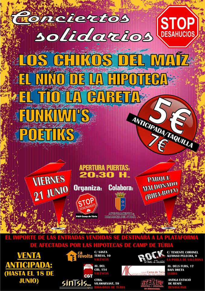 La Plataforma de Afectadas por Hipotecas de Camp de Túria organiza unos conciertos solidarios para recaudar fondos, mediante las entradas vendidas, con el objetivo de autofinanciarse. Como grupos colaboradores podremos disfrutar de LOS CHIKOS DEL MAÍZ, EL NIÑO DE LA HIPOTECA, EL TÍO LA CARETA y FUNKIWI’S, además de los sketch de POETIKS. Y como no puede ser de otra manera participaremos de una jornada de protesta en un ambiente festivo, donde podremos compartir nuestras ideas y demostrar, una vez más, que queremos un cambio de la ley hipotecaria pensado para las personas y no para las entidades financieras y los poderes económicos.