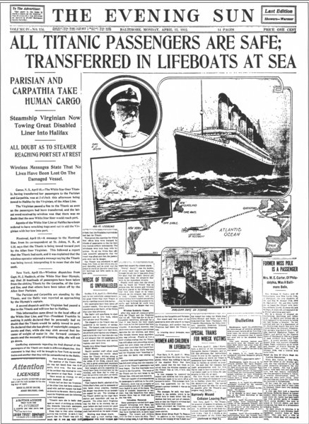 Evening Sun publicó un reportaje en portada que titulaba “A salvo todos los pasajeros del Titanic”. La realidad fue que murieron en el naufragio más de 1.500 personas.