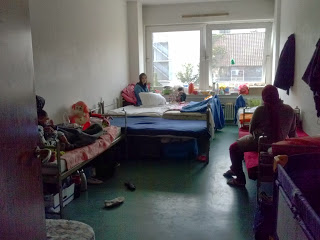 Marwa se ofrece a enseñarme el resto de las habitaciones. Son todas amplias y de grandes ventanales pero insuficientes. Las camas exceden el número de plazas para las que están pensadas . La privacidad no existe. Todos entran y salen, los niños corretean. La higiene roza el límite de lo tolerable. En el cuarto de las duchas, las mujeres lavan la ropa en cubos y la tienden.