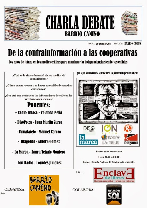 Por intermedio de BARRIO CANINO que es un proyecto que se desarrolla en Madrid y que tambien es emitido por Radio Malva , se realizara el proximo 28 de Marzo un importante y urgente debate sobre MEDIOS DE COMUNICACIÓN ALTERNATIVOS .