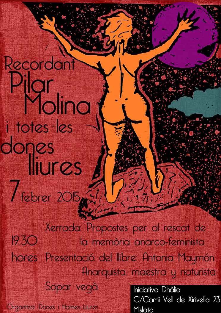 Des de l’Associació Dones i Homes Lliures us convidem a la jornada en record de Pilar Molina que se celebrarà el proper dia 7 de febrer a partir de les 19.30 h. a la Iniciativa Dhalia, coincidint amb la data del seu comiat, el 7 de febrer del 2008.