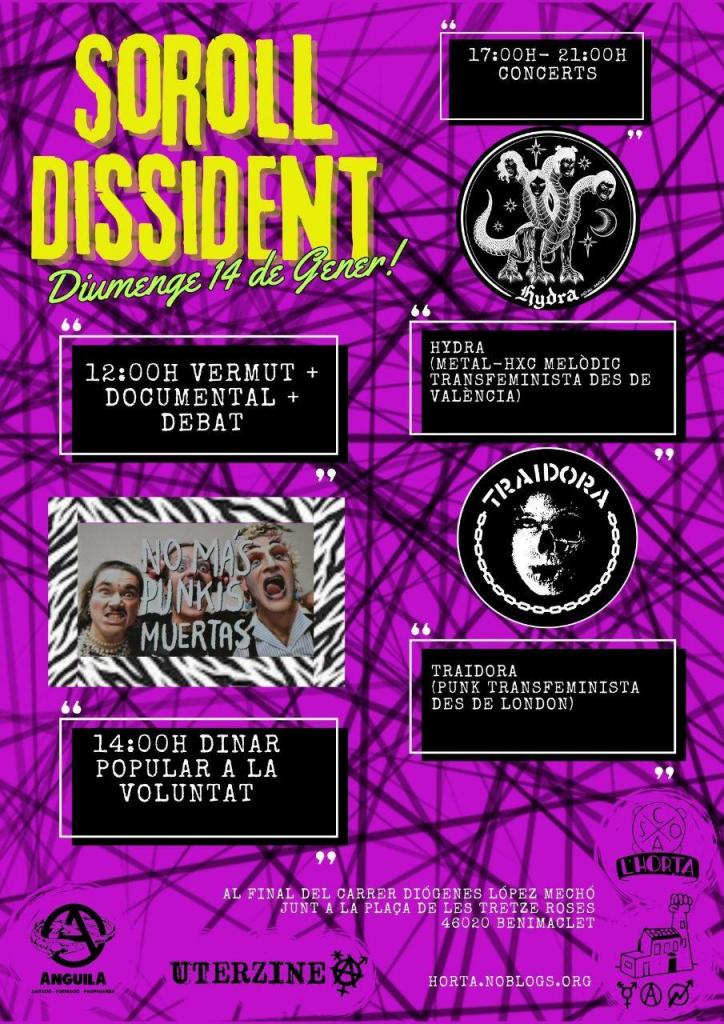 Dedicamos este programa a la jornada ‘Soroll Dissident’ que tuvo lugar el pasado domingo día 14 de enero en el CSOA l’Horta de Benimaclet. Incluimos la charla-debate posterior a la proyección del documental ‘No más punkis muertas’ y una entrevista con la banda de Traidora, que actuó junto con Hydra en la propia jornada.