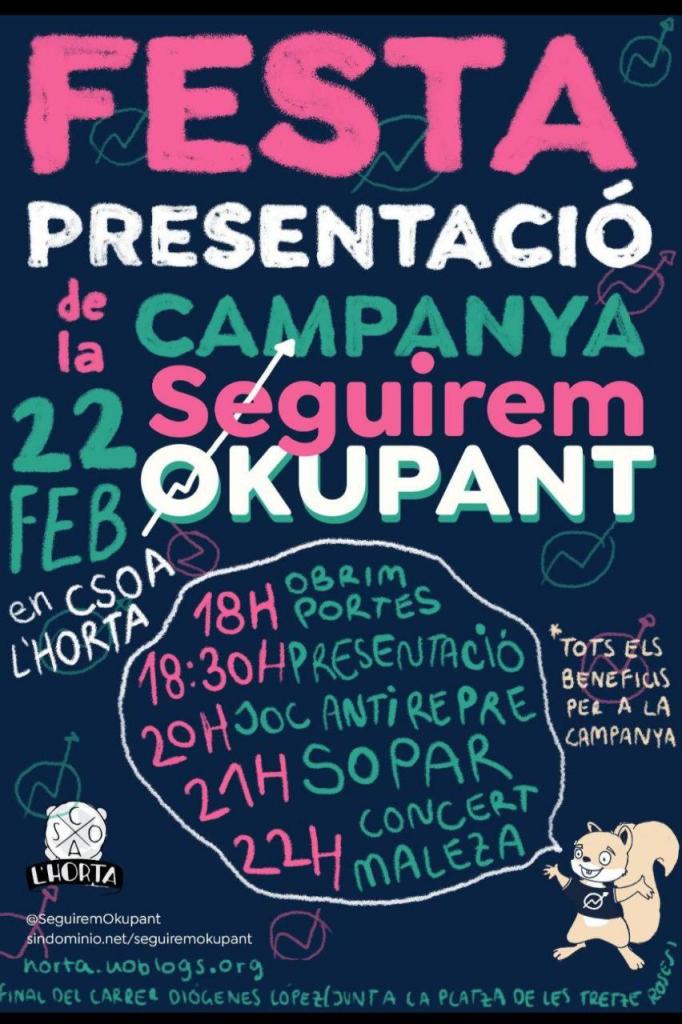 Aquesta és la gravació de la presentació de la campanya ‘Seguirem Okupant’ que l’Assemblea d’Okupes de València va dur a terme el passat dijous 22 de febrer al CSOA l’Horta. Compta amb una presentació de la pròpia campanya, de l’Oficina per l’Okupació de València i amb un trivial participatiu al voltant de la repressió policial.