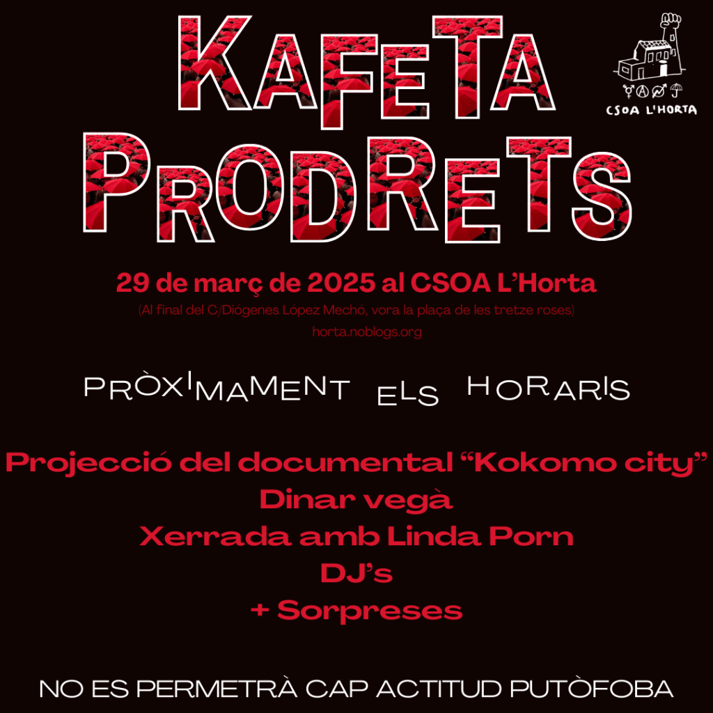 Estamos hasta arriba de trabajo y diversas cuestiones más, así que hoy tenemos un programa bastante liviano y con poco guion, en el cual comentamos eventos que han estado pasando en Valencia recientemente, en especial la Kafeta ProDrets del CSOA l’Horta, y os dejamos presentados dos eventazos que van a rellenar los siguientes programas de TOFUria!: la XXIII Mostra del Llibre Anarquista, y el Encuentro Estatal de Orgullos Críticos y colectivos transfeministas. Entre medias, las típicas bromas, referencias vascas, homosexualismo extremo, dominación y hate a la gente que lo merece.