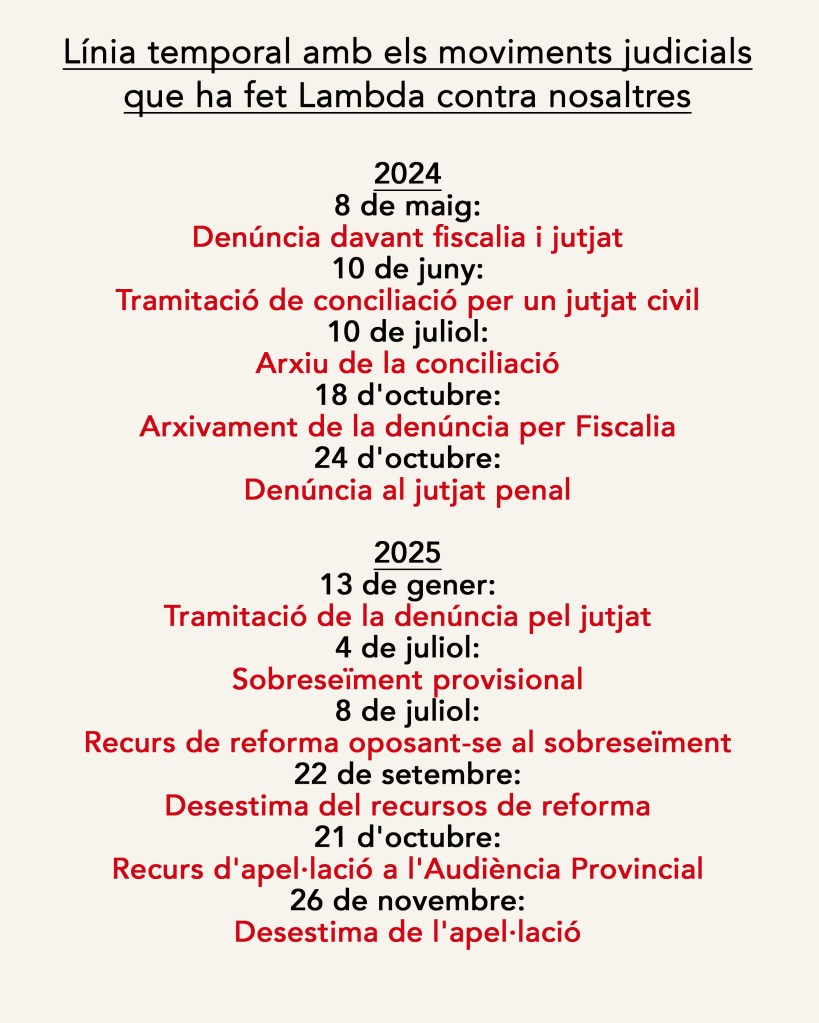 Si alguni creu que exagerem atribuint a Lambda una intenció recurrent d’aconseguir que ens tancaren i tancar Ràdio Malva, ací vos deixem una línia temporal amb els moviments judicials que ha fet Lambda contra nosaltres, deixant-se en cadascun una suma de diners que calculem en milers d’euros: